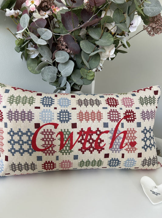 Cwtch Embroidered Cushion on Welsh Tapestry Effect Fabric